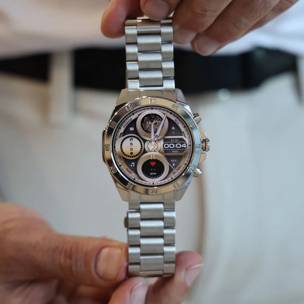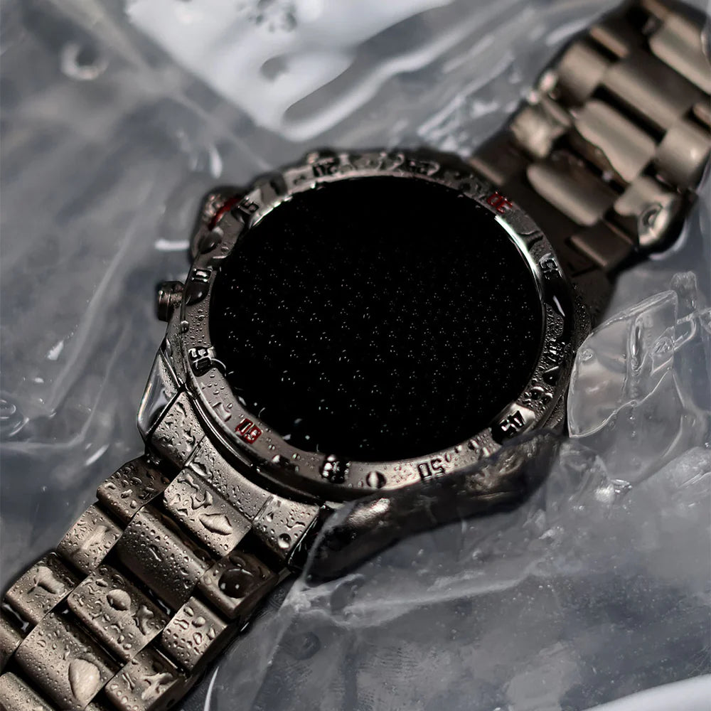 Fabricado con los materiales más resistentes de la industria como Acero Inoxidable (904L), Aleación de Zinc y Titanio, nuestra última innovación es el único smartwatch completamente metálico que puede resistir condiciones extremas mientras mantiene un aspecto elegante.