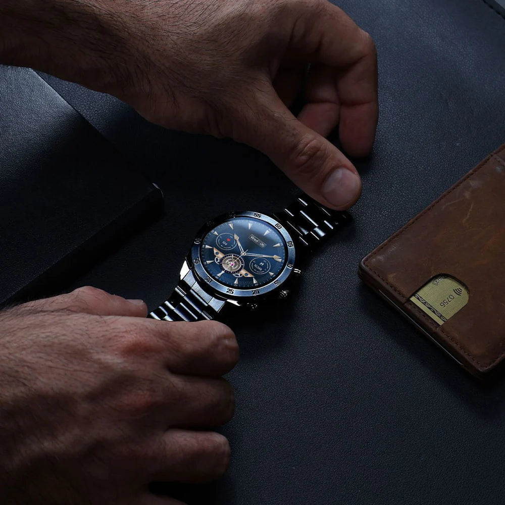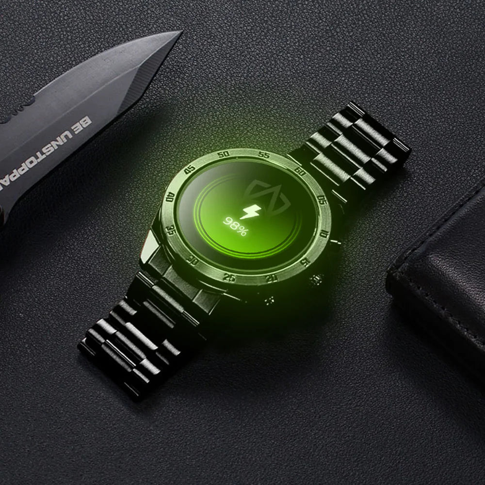 Duradero, metálico y repleto de funciones inteligentes. El Commander une estilo táctico y tecnología moderna en un reloj robusto que resiste tus días intensos, entrenos, aventuras — o simplemente la rutina urbana. Perfecto para quien exige estilo, resistencia y conectividad.